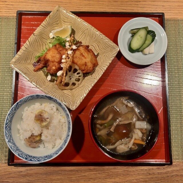 昼膳(¥3,850) 主菜:重ね煮長芋のふわふわ揚げ・七味