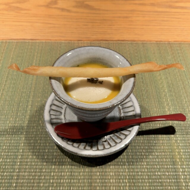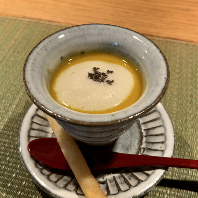 昼膳(¥3,850) 小吸物椀:重ね煮かぼちゃのヴェルーテ 春巻きチーズステック