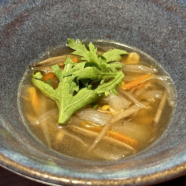 旬野菜の野々庵コース(¥6,600) 穀物と野菜の重ね煮スープ ごぼうととうもろこし