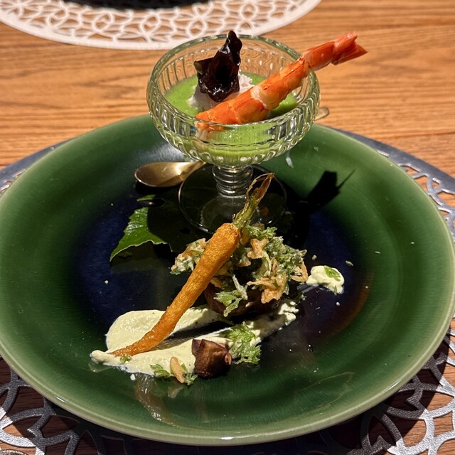 旬野菜の野々庵コース(¥6,600) 海老と里芋ときくらげブロッコリーのソース