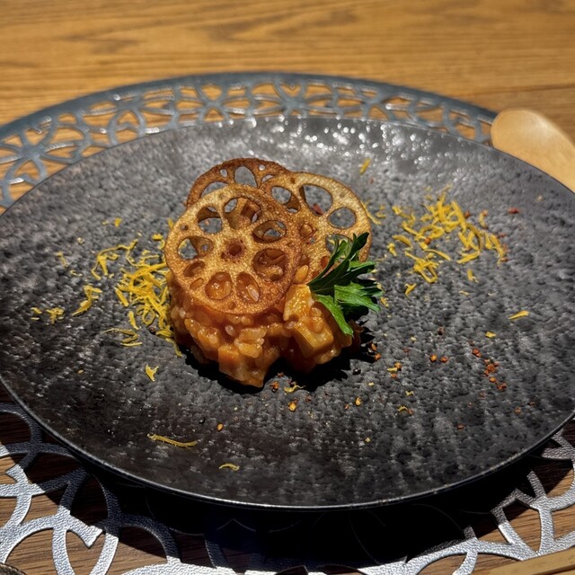旬野菜の野々庵コース(¥6,600) 安曇野産無農薬米の味わいリゾット レンコン