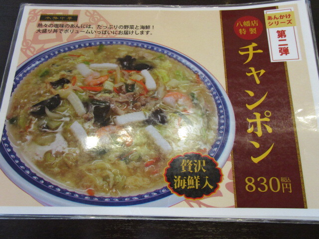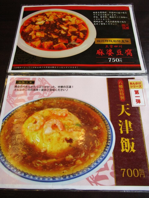 ラーメンメニューは、天理系のサイカラーメンを中心に、醤油、チャンポンが存在します。その他、八幡店オリジナルとして麻婆豆腐、麻婆飯、麻婆麺が存在します。単品メニューも複数存在します。