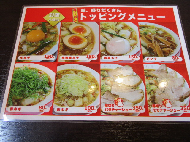 彩華の八幡店は、直営店にも負けない、ラーメンの質と、迫力の厚切りチャーシューが魅力だなと思います。癖になる味わいで、また利用したいと思います。
