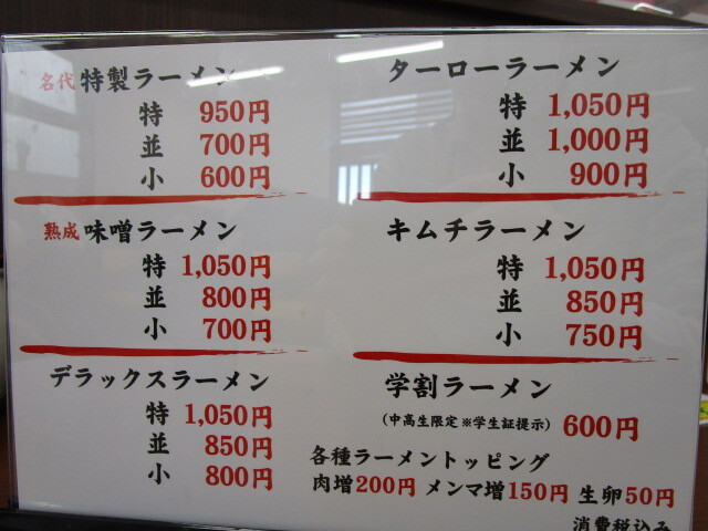メニューは、基本の醤油の特製ラーメン、味噌ラーメン、厚切りバラ肉入りのデラックス、甘辛く味付けたバラ肉入りのターロー、キムチラーメン、学割ラーメンがあり、それぞれサイズ、トッピングなどで値段が変わります。