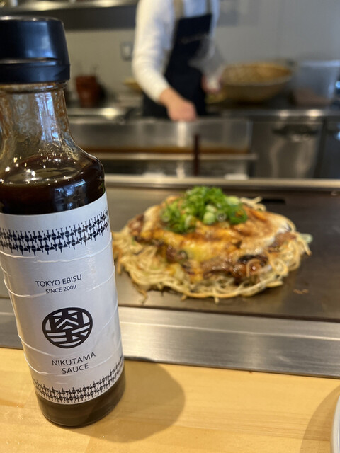 卵を丸く広げたら、本体をひっくり返しその上に半熟状態で重ね、ソース、ネギで仕上げ。
