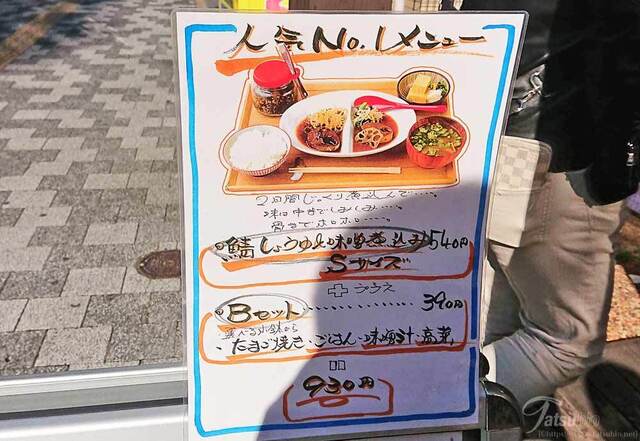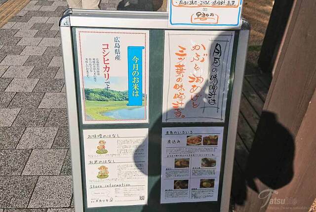 店先には立て看板もあり、メニューや今月のお味噌汁の内容、人気No.1のメニューの紹介なども。