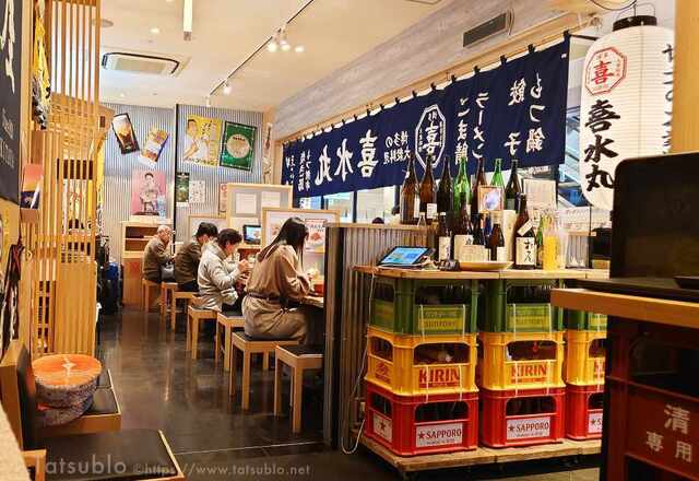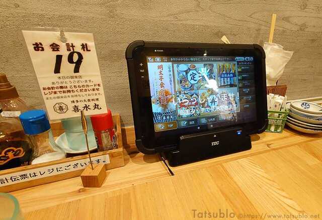 博多駅周辺は何度かお店を紹介していますが、美味しい店が次から次へと見つかりますね!この日もお昼を食べるために色々とお店を探し歩きましたが、この看板を一目見てこちらの店に決めました!これ見たら、否が応でも惹かれますよね〜「明太子食べ放題」福岡ならではですが、いくらでも食べられるのなら地元民でも観光客でも気になってしまいます。お店の名前は「喜水丸」系列店は福岡に数店舗あり、名前は聞いたことあっても、行ったのは初めてのお店でした。もちろん料理自体も美味しく頂けましたよ。お店は博多駅隣の商業ビル「KITTE博多」にあり、9階の飲食店フロアの中にあります。博多駅からすぐなのでアクセスは抜群ですよね。県外からの方でも迷うことなくアクセスできると思います。「KITTE博多」を9階まで登るとあります「喜水丸」横に長い大きな暖簾が掛かっているので店もわかりやすい!普段は行列ができる事もあるそうですが、この日は1組ほどしか並んでなかったので運が良かったのかもしれません。そして惹かれる立て看板も。定食がずらっと並んでますが、中でも選べる定食(「二品よりどり定食」「九州せいろ蒸し定食」)が良いですね〜選べるのって頼みたくなります。そしてその隣が先ほども載せた「明太子食べ放題」の看板。定食や丼を頼むと頂けるという大サービス!しかも「ごはん」「味噌汁」のおかわりまで無料。と、いう事で店内へ。テーブル席にはドリンクメニュー(アルコール類)があります。昼からも飲めるみたいですね。そして注文はタブレットのタッチパネルで注文します。どちらかと言うとタッチパネルでの注文が好きなので、これはいいですね。タッチパネルが嫌いという人もいるみたいですが、確実に注文した料理が届くのでボクは好きです。(ごくたまに違う商品が届いたり、間違えがあったりもします…)ボクが選んだのは、やはり「二品よりどり定食」おかずを2品選ぶ定食で価格は税込1,680円。おかずは魚系から肉系、サラダなど15品と多彩ですね。その中から選んだのは「五目揚げ出し豆腐」と「天ぷら盛り合わせ(4品)」に。奥さんは、もう1つの選べる定食「九州せいろ蒸し定食」の「刺身(三種)」「雷山豚(バラ)」に。ちなみに席は90分制になっています。注文した天ぷら定食それほど待つ事なく、注文した定食が到着。定食にはご飯、味噌汁、小鉢が付いてきます。選んだ天ぷらも揚げ出し豆腐も美味しそう。揚げ出し豆腐は珍しい五目揚げ出し豆腐。そして、こちら!お目当ての食べ放題の明太子、高菜は別容器で運ばれてきます。量もたっぷり入っていますね〜ご飯のお代わりもできるんで、まずはおかずと一緒に頂きます。明太子ばっかりに目が行きますが、普通に天ぷらやご飯、味噌汁も美味しかったですよ。揚げ出し豆腐もしっかり味が染みていて、全ての料理がレベル高い定食ですね。もちろん、おかわりして明太子を乗せて頂きます。うん、福岡人でもそんなに普段から食べる事はないので目一杯食べられるのは嬉しい!明太子があれば何杯でも食べられるって訳ではないですが、もう一杯おかわりしちゃいましたw(ついでに味噌汁もおかわり)計三杯頂いて、お腹も充分満たされてごちそうさま。奥さんが頂いた「九州せいろ蒸し定食」はこちら。二人でご飯は三杯ずつ頂きましたが、明太子はまだまだ残っていました。なので明太子を思う存分乗せて食べることも可能ですね!今回は、最初から決めて入った訳ではなく、あの看板に惹かれて入りましたが、いい意味で大いに予想を裏切るランチでしたね。福岡に数店舗ある「喜水丸」、こちらのお店以外でも明太子の食べ放題をやっている所もあるので、チェックしてみてはいかがでしょうか。