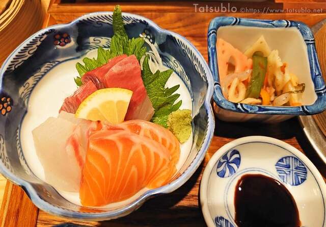 奥さんは、もう1つの選べる定食「九州せいろ蒸し定食」の「刺身(三種)」「雷山豚(バラ)」に。