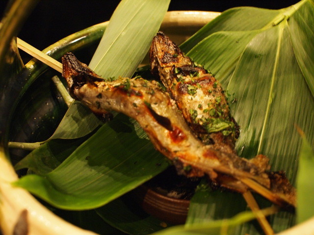蓼酢は添えず、蓼の葉を少量まとわせて焼いた鮎。
