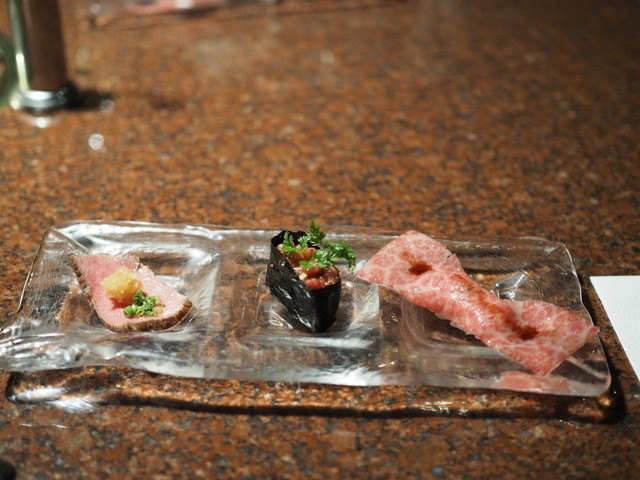 牛刺し3種は、脂の融点が低い雌牛ならではの脂の甘さで美味しい。