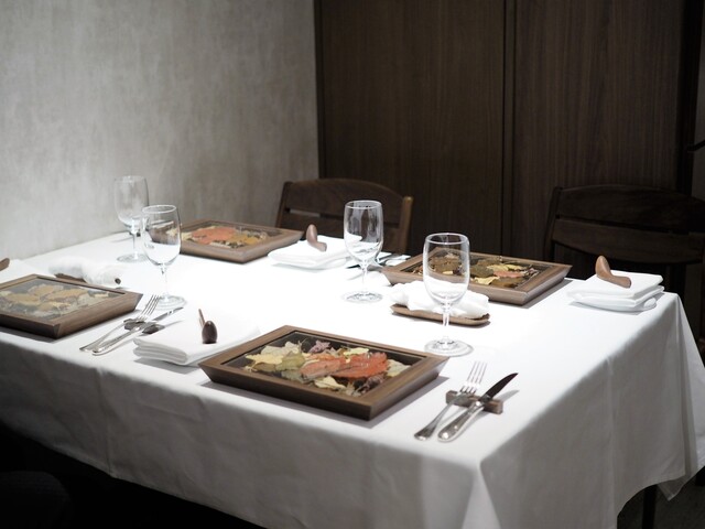 アラカルトにしようかと思っていたのですが、当日シェフの熱いプレゼンテーションにコロリとやられ、ジビエ尽くしのシェフお任せコースにしました(14000円)。