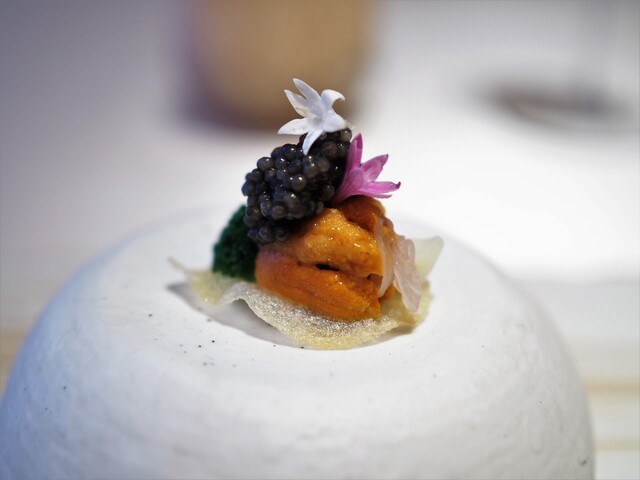 葛粉のチップスにキャビアと赤雲丹、ブロッコリー、百合根、ペンタス(エディブルフラワー)を乗せた一品。
