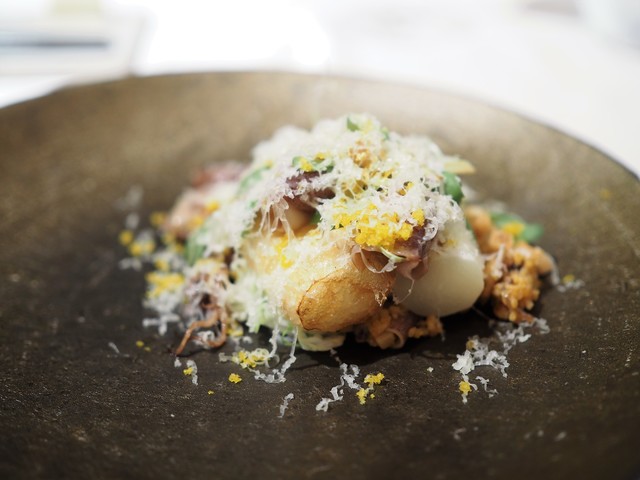 たっぷりのトリュフや鮎のペーストのコクが、ツブ貝の旨みと渾然一体の余韻を残す。