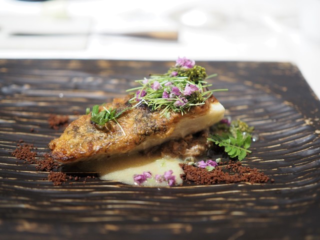 琵琶湖の鱒を38℃(鱒の脂が溶け出す温度)で火入れし、オリーブオイルのパウダー、八丁味噌やほおずきのピュレ、文旦とディルのクリームなどを添えたもの。
