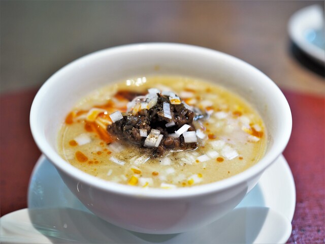 清湯スープに飯蒸しは、清湯スープの旨みを米の甘みが優しく受け止め、スープ単独よりも深みがある。