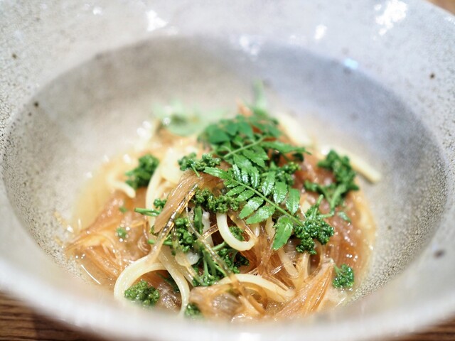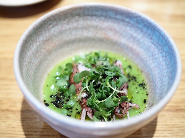 ホタルイカの旨みが奥行きを出して、大徳寺納豆の塩気が全体を引き締め、とても綺麗かつ繊細ながら立体的な皿になっている。