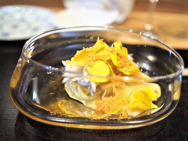 一方で、トマト出汁で旨みと酸味を付けたスープ入りの三輪素麺(セモリナ粉の素麺)も添えて、柔らかな酸味で蟹を頂くことも同時に楽しめる。