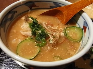 冷や汁は、宮崎県の代表的な郷土料理です。焼いたあじ、いわしなどをほぐし、焼きみそをのばした汁に、豆腐、きゅうり、大葉などの薬味を入れてアツアツのご飯(または麦飯)にかけて食べる夏のスタミナ食です。食欲のない暑い時期に食べやすい上、栄養補給もできる、昔の人の知恵が生かされた料理です。