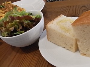 お店の情報をみたところによると、お野菜が自慢みたいです。レタスのサラダとトマト?パプリカ?のスープ付き。