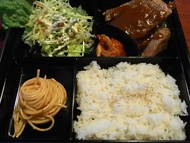 おかずはサラダとスパゲティとキムチ、肉にはデミグラスソースがたっぷりかかっていました。