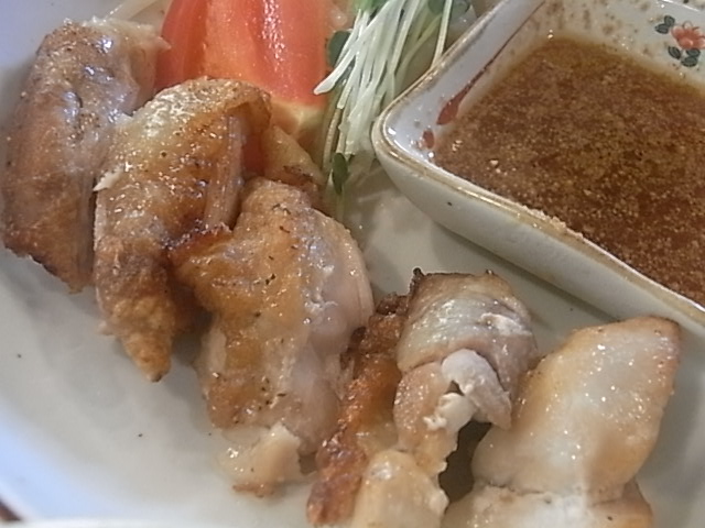 ぷりぷりチキンソテーとおろしダレ(だったかな?)と素朴サラダも、どれもこれもちょうどいい量で、味わって食べれます。