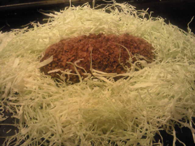 すごくないですか??メンチカツサイズ500gらしい。メンチカツはこの状態で届き、鉄板の上でキャベツを敷き詰められる。温まってきたら・・・