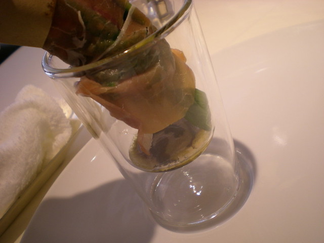 このサラダはグラスに入ったドレッシングにつけて食べるんですが、サラダをグラスに入れてつけるっていう新しい感じ。↓こんな感じです。↓