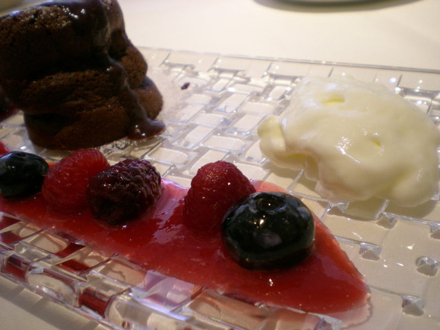 チョコレートスフレの横にあるのがカシスかなぁのソルベ。これがまたおいしくって、もっと食べたかった。