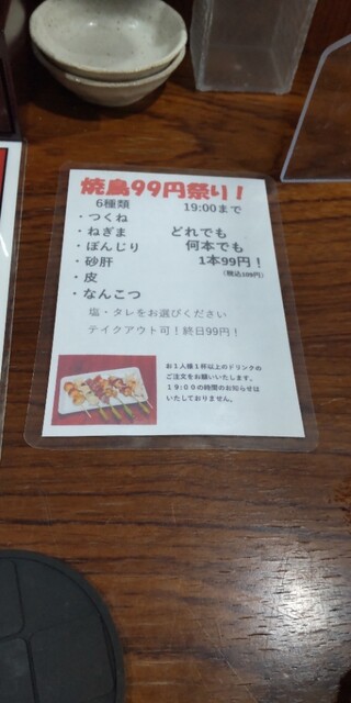 常磐津節の会が有り成増に初めての街ちょっとそわそわ、16時に終わったので店探し17時に成らないと駄目かなと思いつつ駅前ぶらぶらした処で発見良さげな店一人でもカウンター有り入店、頼んでみたら、美味しい16時から入りましたが結構混んでる、若い店員さん方がキビキビ動いていて最高です、19時迄のタイムサービス99円祭り、つくね、ねぎま、ぼんじり、砂肝、皮、なんこつ、が何と99円ビックリ、店の雰囲気も最高、店内禁煙イイネ、全てのメニューがリーズナブル、呑んべには有り難いです。次回は仲間を連れて来たいいい感じでした。今回はハイボール大、中2杯とつくね、ぼんじり、砂肝、ナムル、を頂き2,000円以内早めの時間なら千ベロが出来る店ご馳走様でした。