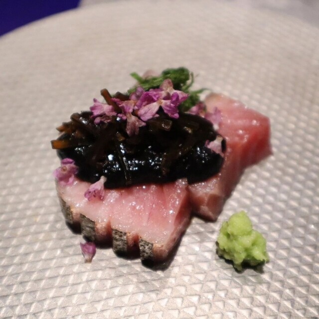 ボストン本鮪の胡麻油焼き カダイフ、トリュフ、山葵醤油