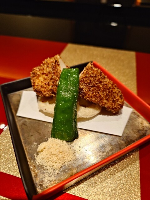 脂の乗ったノドグロにライスペーパーと海苔を合わせた一品。