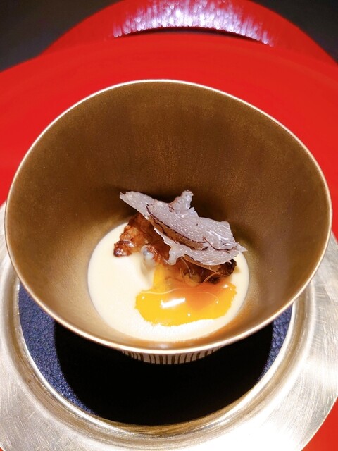 【安納芋のベシャメルとキクイモフリット 卵黄、黒トリュフ】