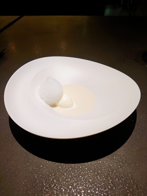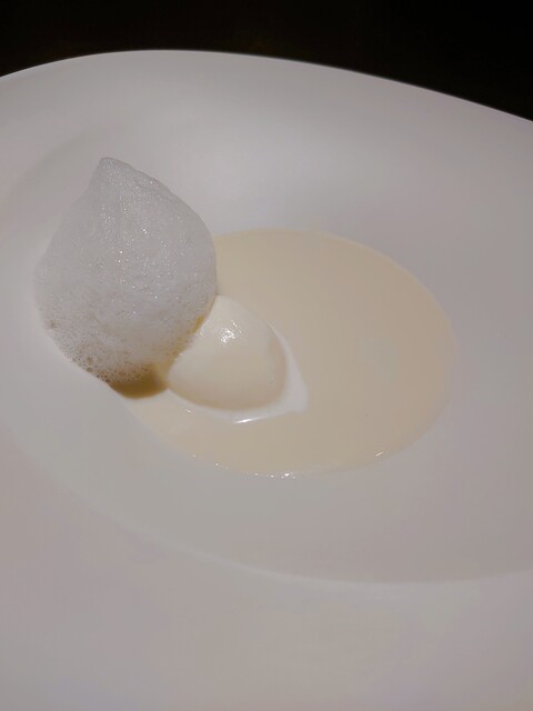 バターのジェラート、胡椒の泡を合わせます。