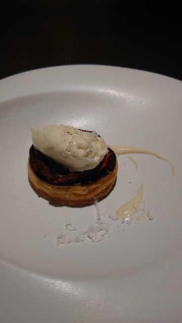 玉葱のパイ包み焼き、パルミジャーノ・レッジャーノのジェラート。
