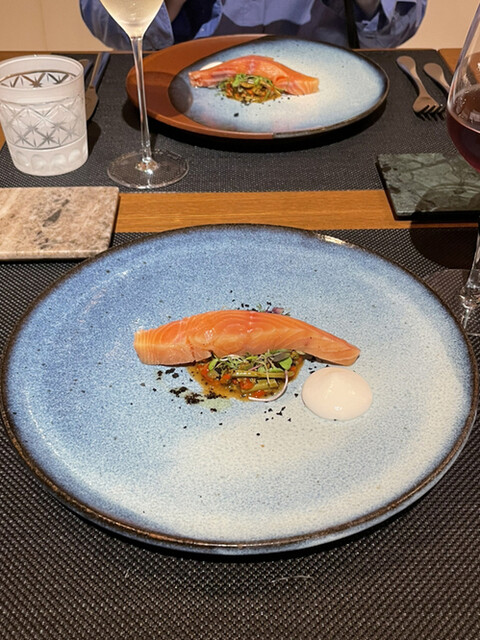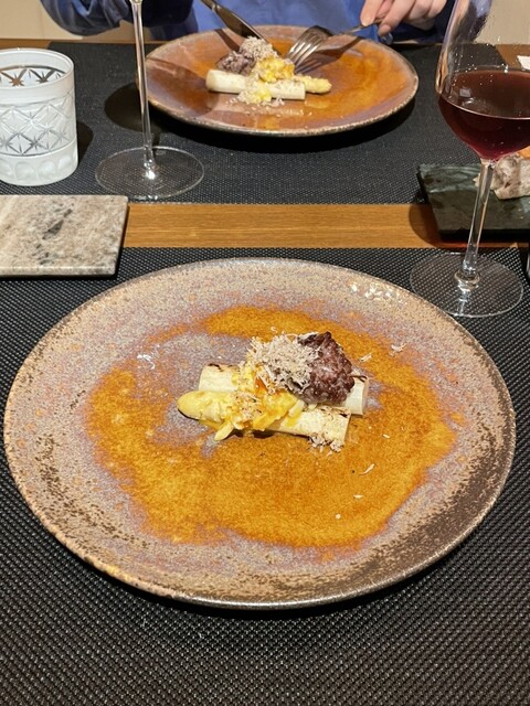 ホワイトアスパラガス(半熟卵と馬肉の肉団子)