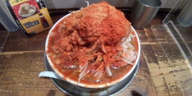 着丼:上から見るとヤサイは少な目だと思ったが、横からの写真を見るとピラミッドのようなヤサイ。以前は辛い奴はヤサイの上に赤い唐辛子の粉末が載っていたのだが、前回もそうだが唐辛子が混ぜられ赤いスープ。ぶっというどんのような麺。ごろっとしたチャーシュー。辛い物好きな私、特別辛くはない。久々の二郎系で麺とヤサイは完食できたがスープは結構残した。歳のせいか二郎系の量が多く、そして塩気が気になる。トホホ。それでも時々無性に食べたくなる。
