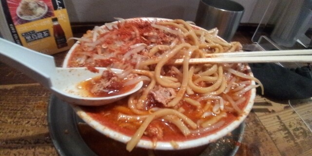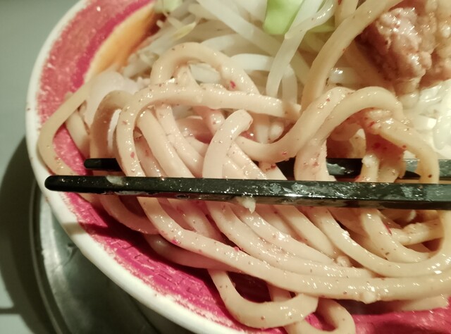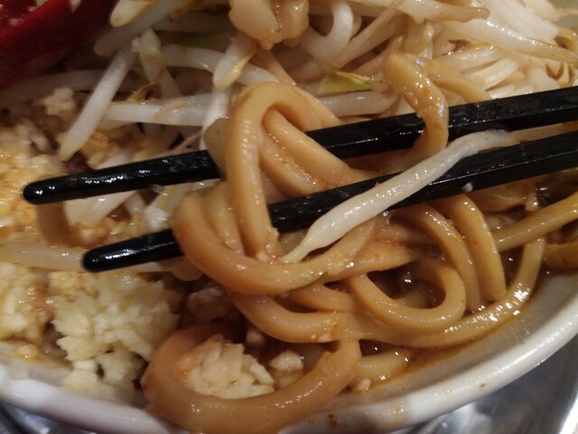 着丼すると、赤い唐辛子が野菜が隠れるほどの量。チャーシュウは野菜の下に隠れていて見えない。発掘作業で4枚発見。外形は小ぶりだが厚みがあるので結構な量、私には十分。まず、赤い部分の野菜とスープを口に運ぶ。見た目ほど辛くはない。野菜を食べ進めると麺に到着。極太の腰のある麺が現れた。