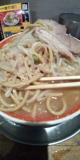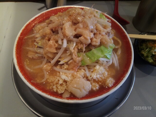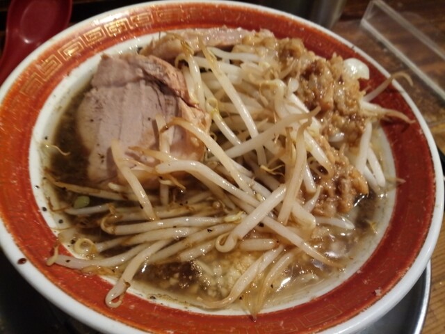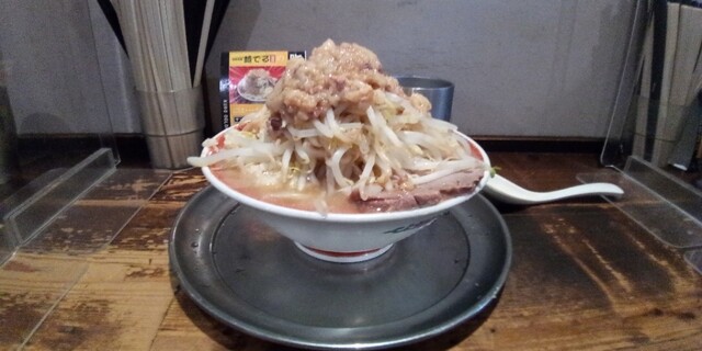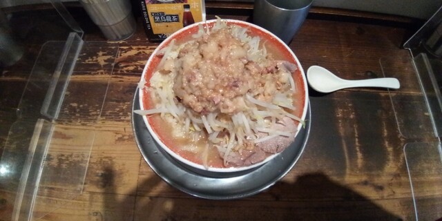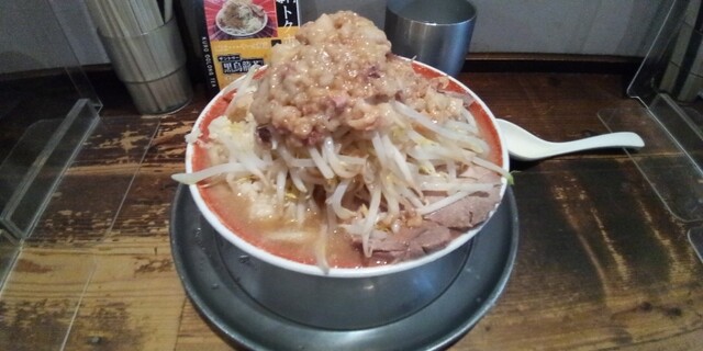 最近、歳のせいか二郎系の麺量が…。ここは250g(二郎系では少な目)と言われているが、実際はそれより多いのかも。麺 少な目と言おうとしたが今日は私の記念日。