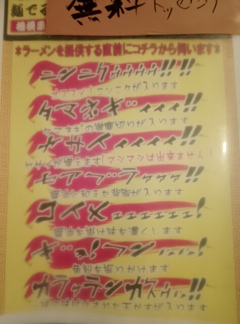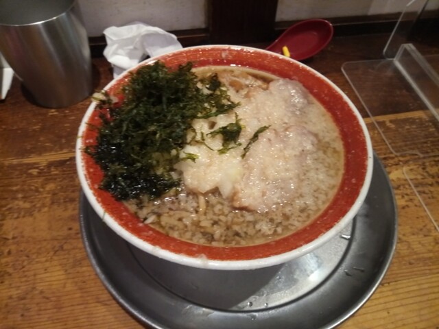コールは、着丼前に聞かれる。今回はニンニクマシマシ、背脂マシ、辛いてんかす。