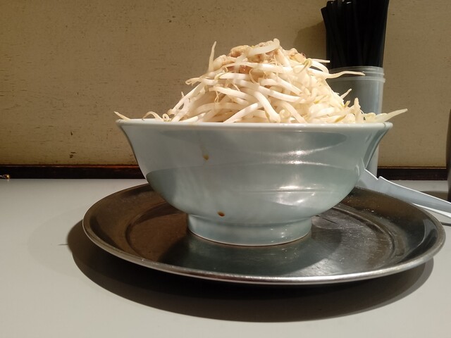 いつものように、ヤサイから食す。かなりしょっぱい。だんだん味が染みてきてしょっぱさがましてくるよう。そのうちスープが見えてくる。真っ黒、生醤油かと思うほど