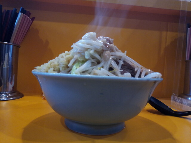 着席すると食券を集めに来る。辛い奴は、初めてなので、辛さを2倍にした。辛さは4倍まで選べる。コールはこの時に行う。ニンニク、アブラ マシマシ。
