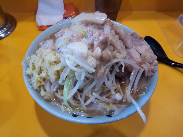 キャベツとモヤシの小山の頂上には大量の白いアブラ、ふもとには分厚いチャーシュー2枚と大量のニンニク。