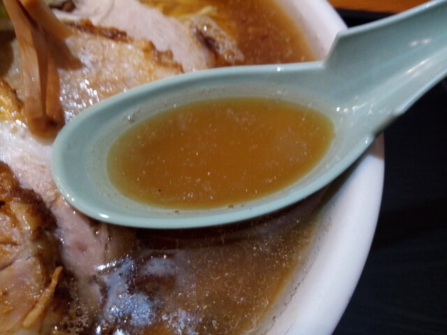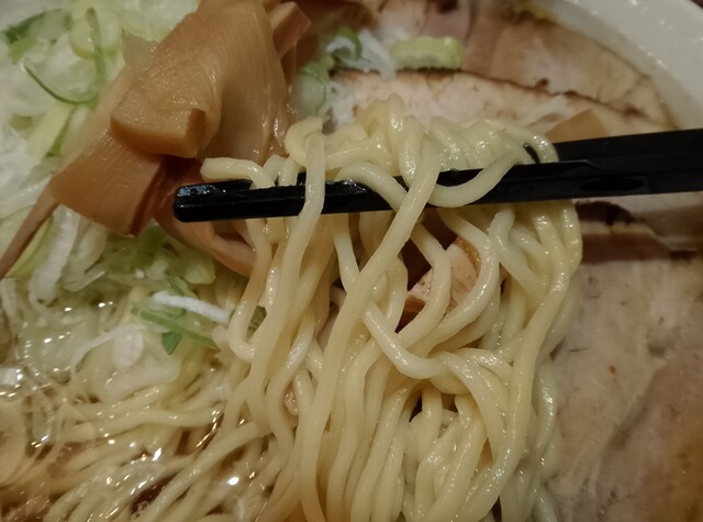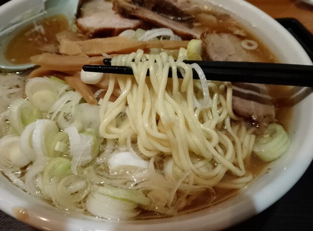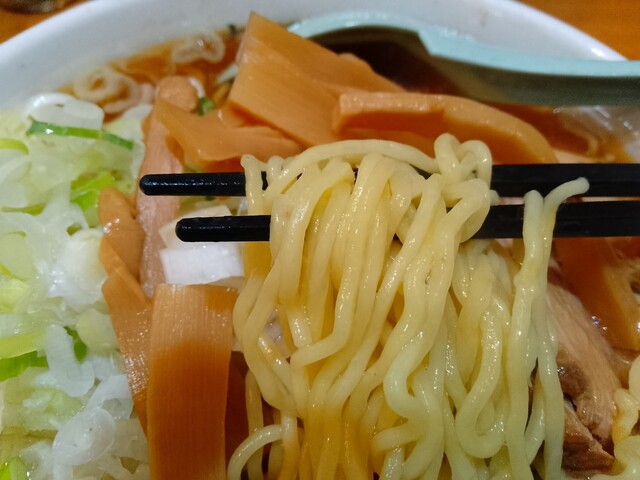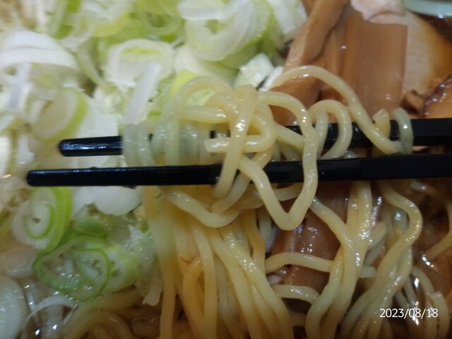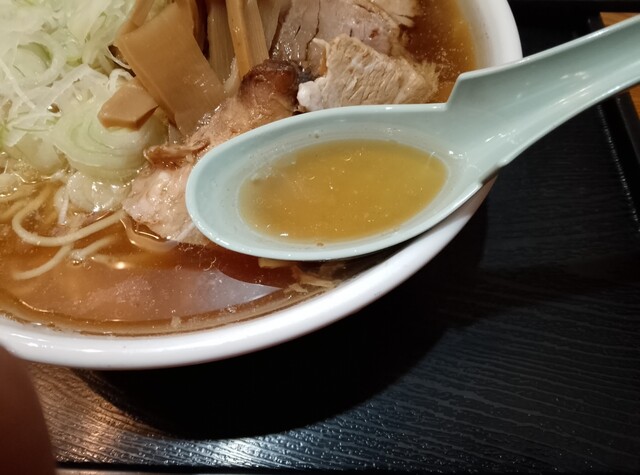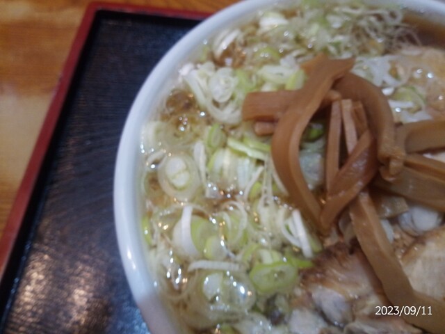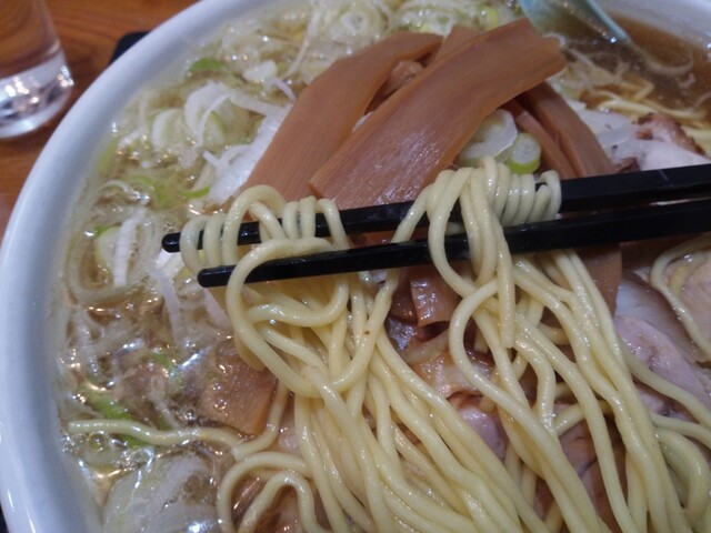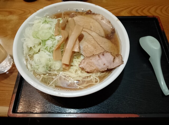 着丼。麺はかなり多い。歳が重なるにつれ大をいつまで大を食べきれることか。普通盛でも普通の店の大盛なみなので注意。チャーシューもチャーシュー麺なみの量。しかもチャーシューの下にチャーシューが隠れている。ネギもかなり多め、ネギ多めを頼まなくても大量なのだが、ついつい多めにしてしまう。そして忘れていけないのはメンマ。シャキシャキとした歯ごたえがある食感がたまらない。とても手間がかかる乾燥メンマを水で戻して作っているそうだ。スープは澄んだ煮干し醤油であるが煮干し臭さはない。私的にはもう少し煮干しが主張したほうが好きなのだが。