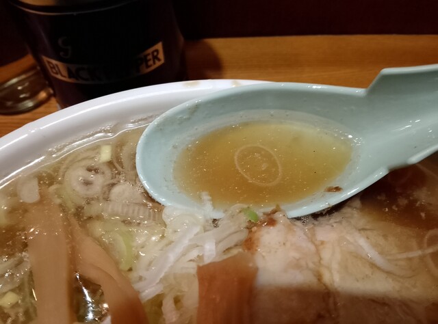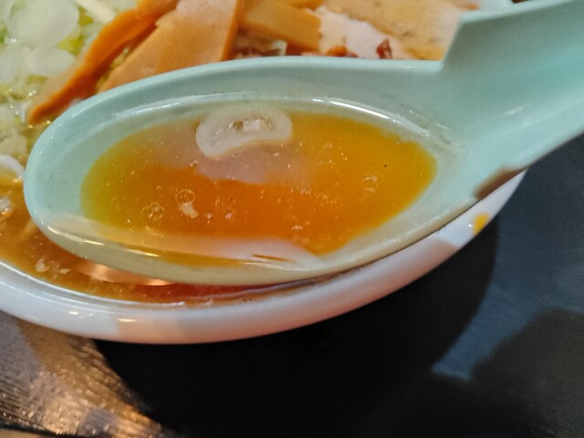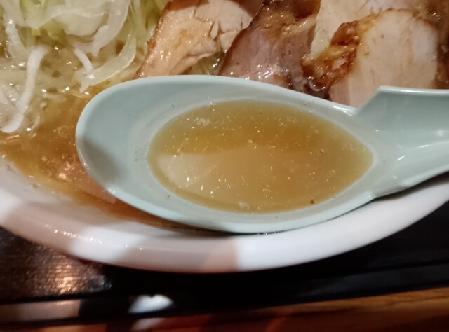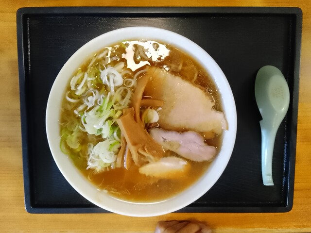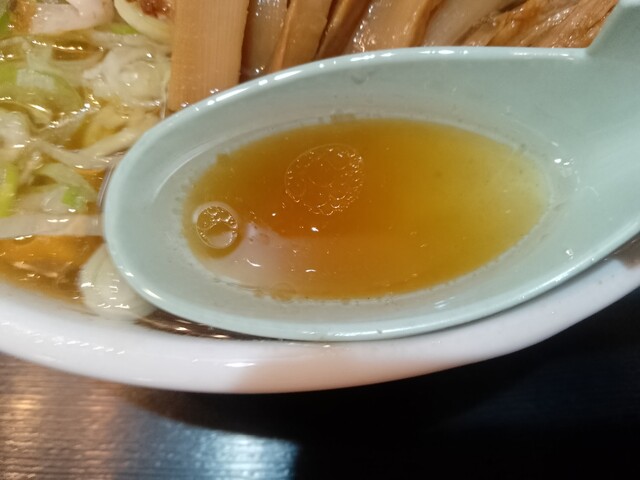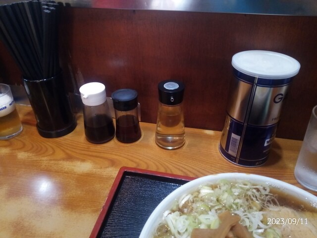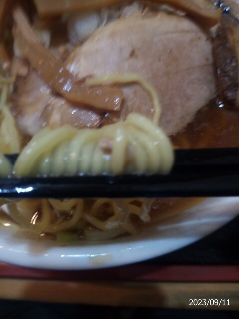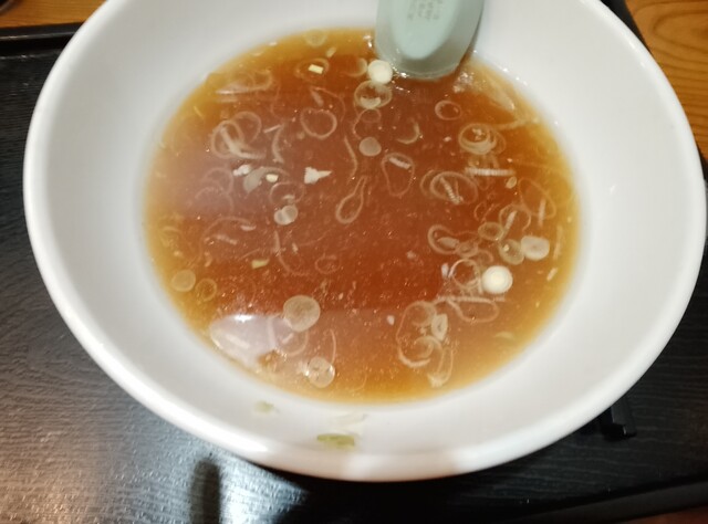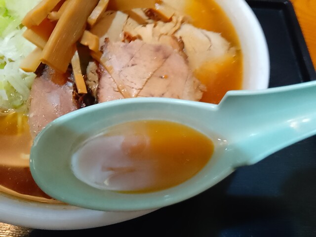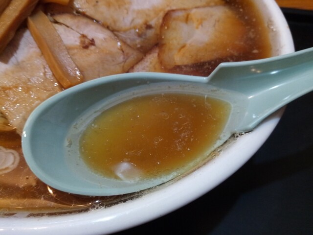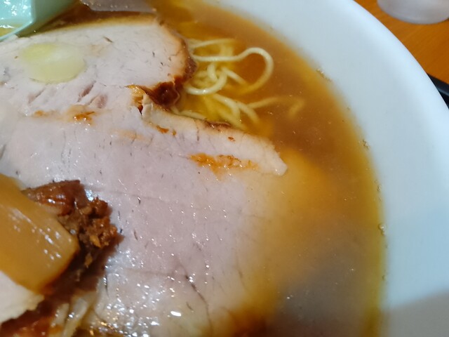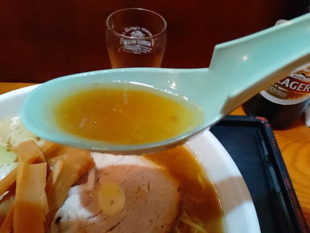 今日もチャーシューがどっさり、チャーシューの切れ端が追加されタップリな量だ。スープはいつもの安定した澄んだ醤油味。上には透き通った脂が厚く浮いている。大盛はらーめん2玉で先の大量のチャーシュー、メンマ、ネギで食べ応え十分。お隣のお客さんはビールも注文している。朝からのビールはとても気がそそられる。次回はビールも注文しよう。