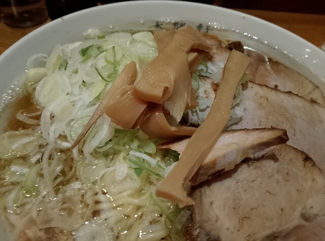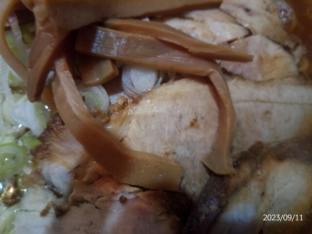 着丼。大きなチャーシューと大量のネギとメンマ。いつものビジュアル。ただ、メンマはいつもより多い気がする。ちょっと得した気分。ここのメンマは特別で手間がかかっていてチャーシューめんよりメンマらーめんの方が値段が上なのだ。実食。麺の量が半端ない。多分、普通のラーメン3玉分くらいかな。そしてそれに負けずにスープもタップリ。深い味わいのスープの上の透明なあぶらの層は今にもこぼれそうだ。心配していた大盛の麺を全てたいらげ完食。おおめで頼んだアブラとネギもすべてすくって完食。今年、最後のラーメンを大勝軒に選んで良かったと思う一杯だった。