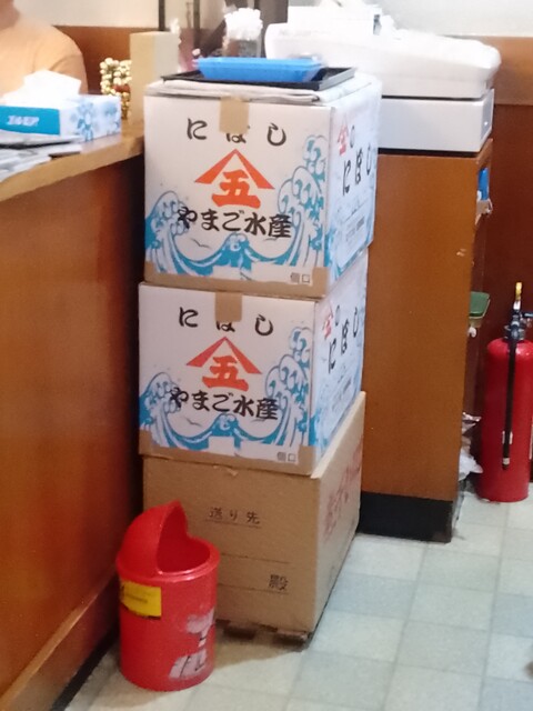 今日も大好きな一番乗り。猛暑の続く昨今、待っていると店のお姉さんが店の前に並べられた傘を開いて使ってくださいと手渡してくれる。そして、開店時間11:00の20分前に暑いからと早めに入店させてくれる。いつもながらとても親切である。このころには5,6人の行列ができていた。11:00にはすでに満席になる地元の人気店。