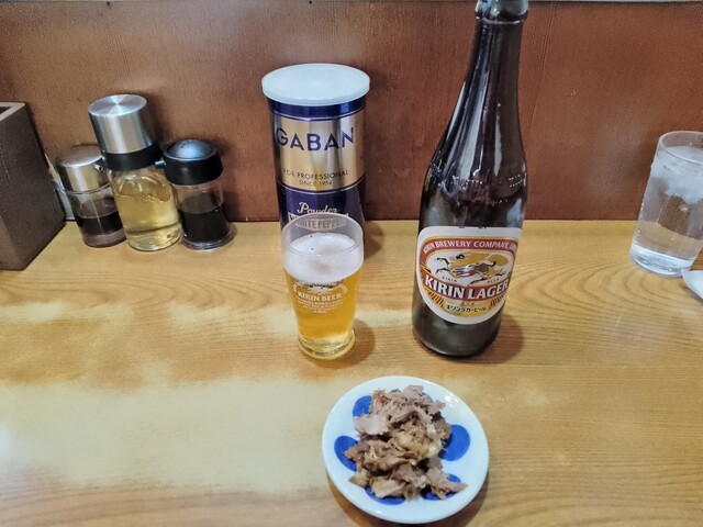 着瓶。瓶ビールとおつまみチャーシュー。完璧な昼呑みのんべー、ぷはー。でも、プラスでらーめん大盛が食べきれるか不安。