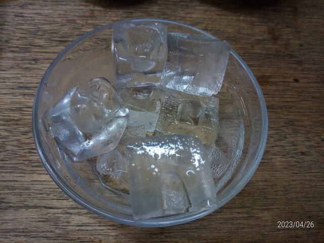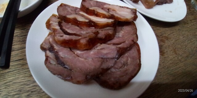 まずは、やかん(洋風のやかんから提供され、なみなみとつがれる焼酎)とウーロン茶、腐乳(中国の豆腐のようなチーズ)、お新香、皮蛋を注文。中国酒五加皮(ウージャーピ)を注文しようとしたが、メーカーが製造中止ということで今は無いらしい。妻は杏露酒。コップになみなみとつがれる。強いお酒なのでストレートに困っている様子を見て、大将が氷と水を出してくれる。そして、私の胸ポケットのタバコを見たのか、店の裏に喫煙所があると案内が。気配り凄い。