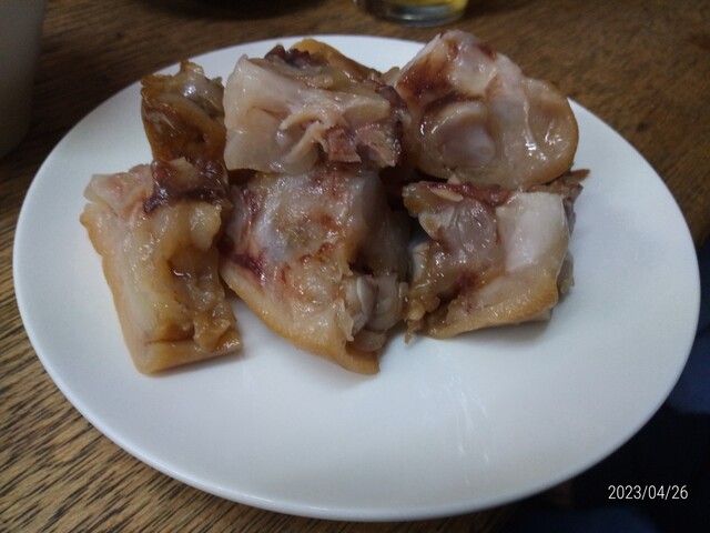 そして、耳、足と次々に注文する。肉は酢とからしを自分で混ぜたタレで頂く、美味しい。そして、楽しみにしてたもつ煮込みを頼むが冬季限定とのこと、残念。代わりに牛すじを注文。これは向かいの店から出前される。こちらの店では加熱が必要な料理は向かいの別店舗から提供されるみたいだ。これもとても美味しい。 結局、メニューの右から左に全て食べつくす。久々に訪れた味珍、懐かしく美味しかった。満腹になり故郷への旅路につく。