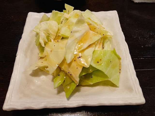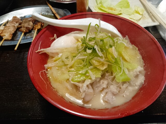 店主さんは一見 個性的な方に見えたが、話をすると気さくで親切な方だった。時間はかかるけどラーメンを作りますかと尋ねられたので、勿論お願いした。まずはお通しのキャベツにおでん おまかせ5本を注文。本日2軒目のはしご酒、焼酎ロックを呑みながら頂く。2軒目のあてには最高。おでんはアゴ出汁だそうで風味が良い。追加で焼鳥も注文。塩だれキャベツに焼鳥は最高である。